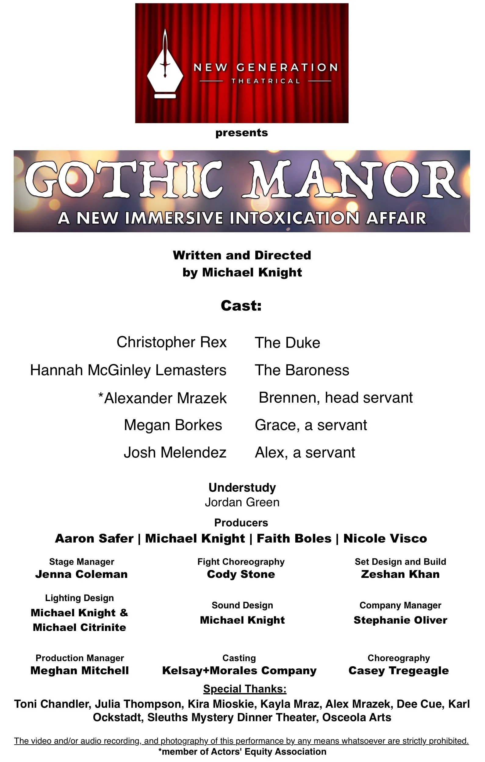 Megan Borkes (She/Her) shopped exclusively at Hot Topic as a teen and so is happy to put that experience to use for Gothic Manor. Despite everything about her, she can be seen full time as an actor at Universal Orlando and has most recently been seen as Ali Hakim in ME Theatre’s Oklahoma, and as Blanche/Ms Granville in Orlando Shakespeare Theatre’s four person Beauty and the Beast - two roles that could not possibly exist further on the theater spectrum. If you see my parents in the audience please tell them thank you for supporting your daughter in everything - very sweet! - but they should probably leave before the show starts. Love as always to my Jason, who appreciates the choice to costume me in a corset for this.